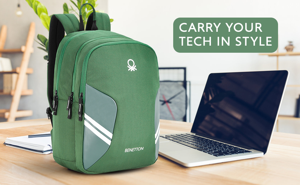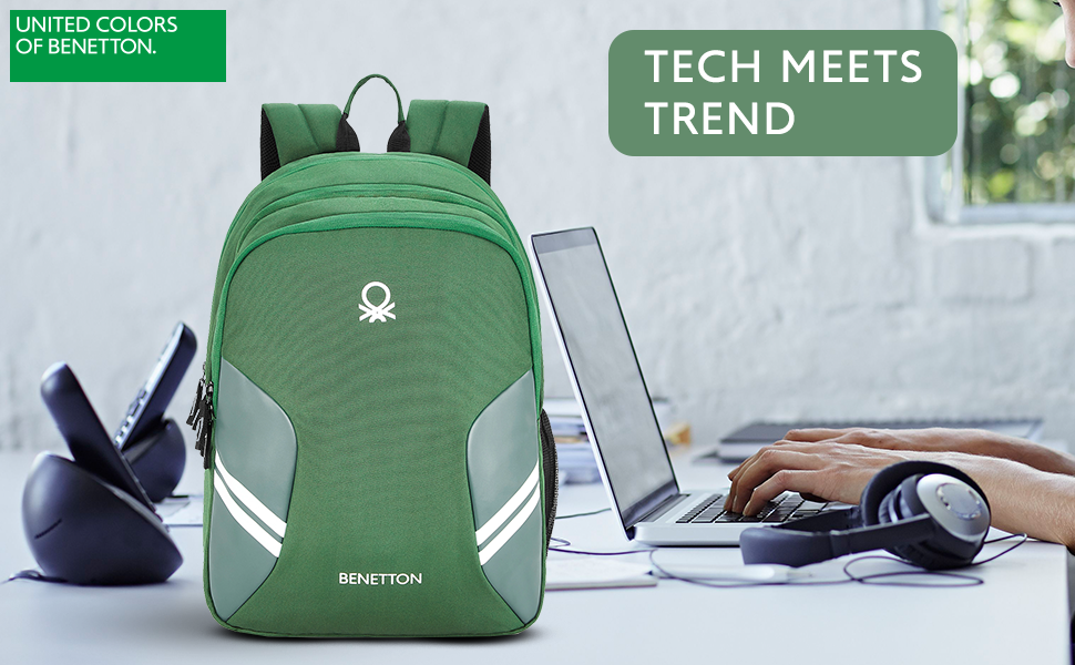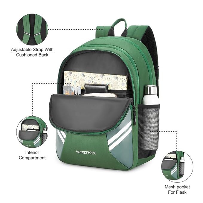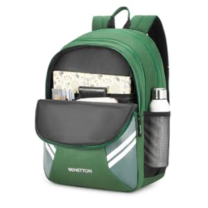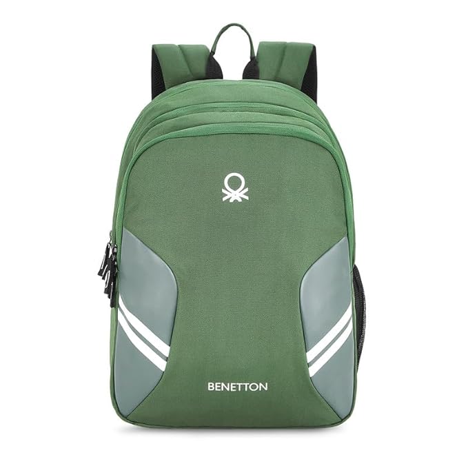 The spacious main compartment provides ample room for books, notebooks, or a laptop, while additional zippered compartments help keep your belongings organized. The premium green finish with stylish side panel detailing and the iconic Benetton logo adds a trendy and sporty look.