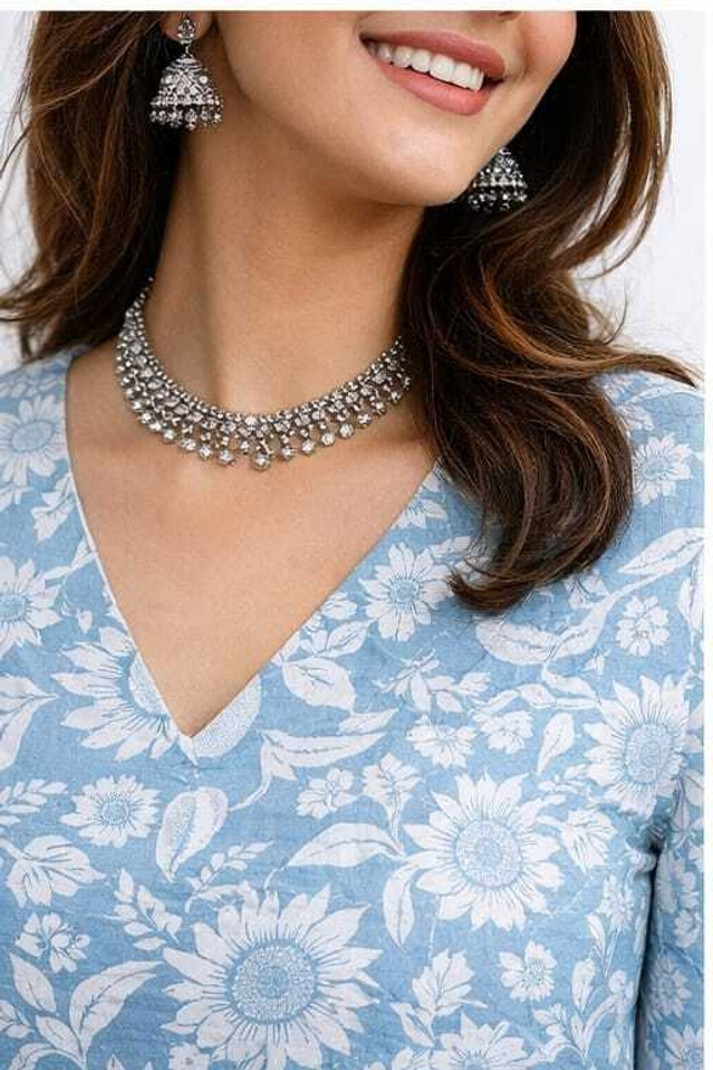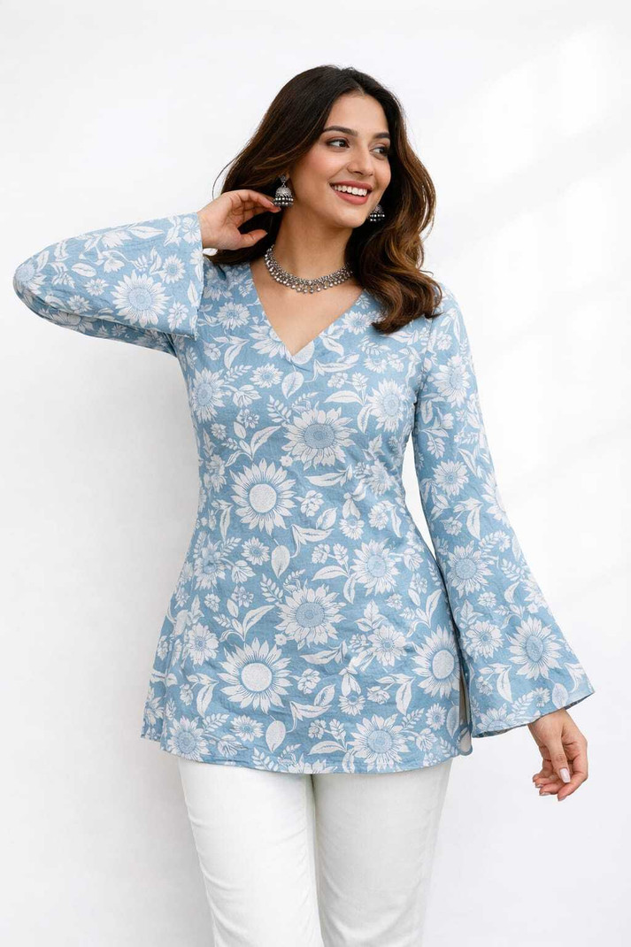 Upgrade your wardrobe with this stylish sky blue floral print top designed for modern women who love comfort with elegance. Featuring a flattering V-neckline and trendy bell sleeves, this top adds a graceful charm to your everyday look. The soft fabric ensures all-day comfort, while the beautiful white floral print gives it a fresh and classy vibe.