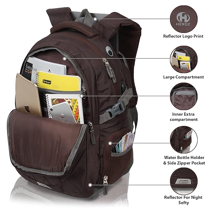 HEROZ Premium Brown Laptop Backpack | Stylish & Spacious College & Office Bag with Multiple Compartments