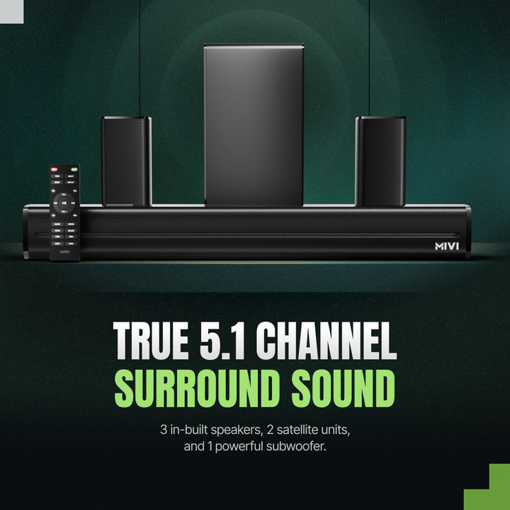 Upgrade your home entertainment experience with the Mivi 5.1 Channel Home Theatre Soundbar System. Designed to deliver powerful, room-filling audio, this premium sound system includes a sleek soundbar, a deep bass subwoofer, and two rear satellite speakers for true surround sound performance.