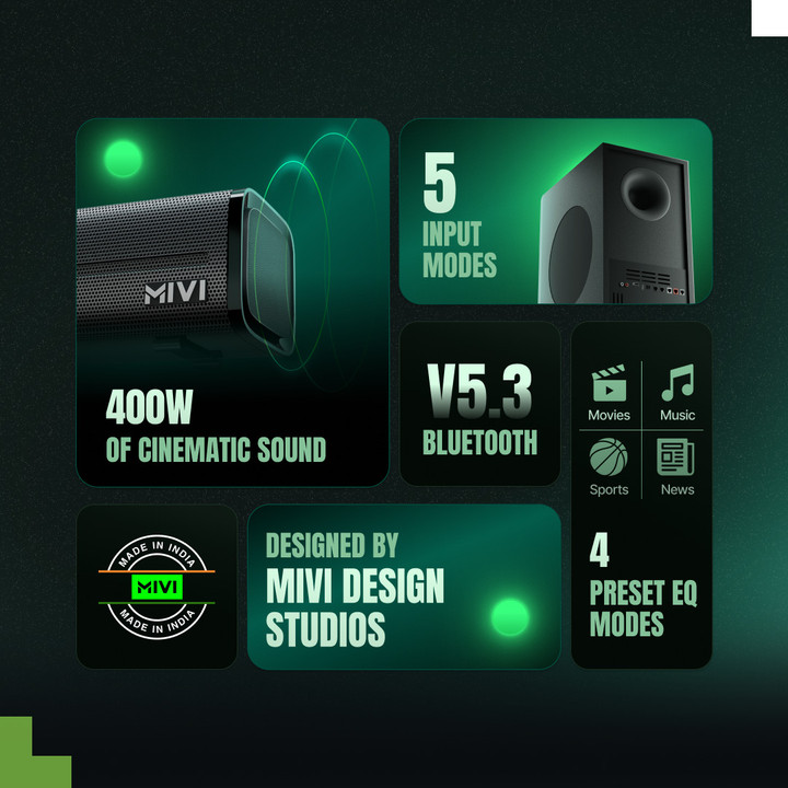 Transform your home into a mini theatre with the Mivi Home Theatre Soundbar System and enjoy immersive, high-quality sound every day.