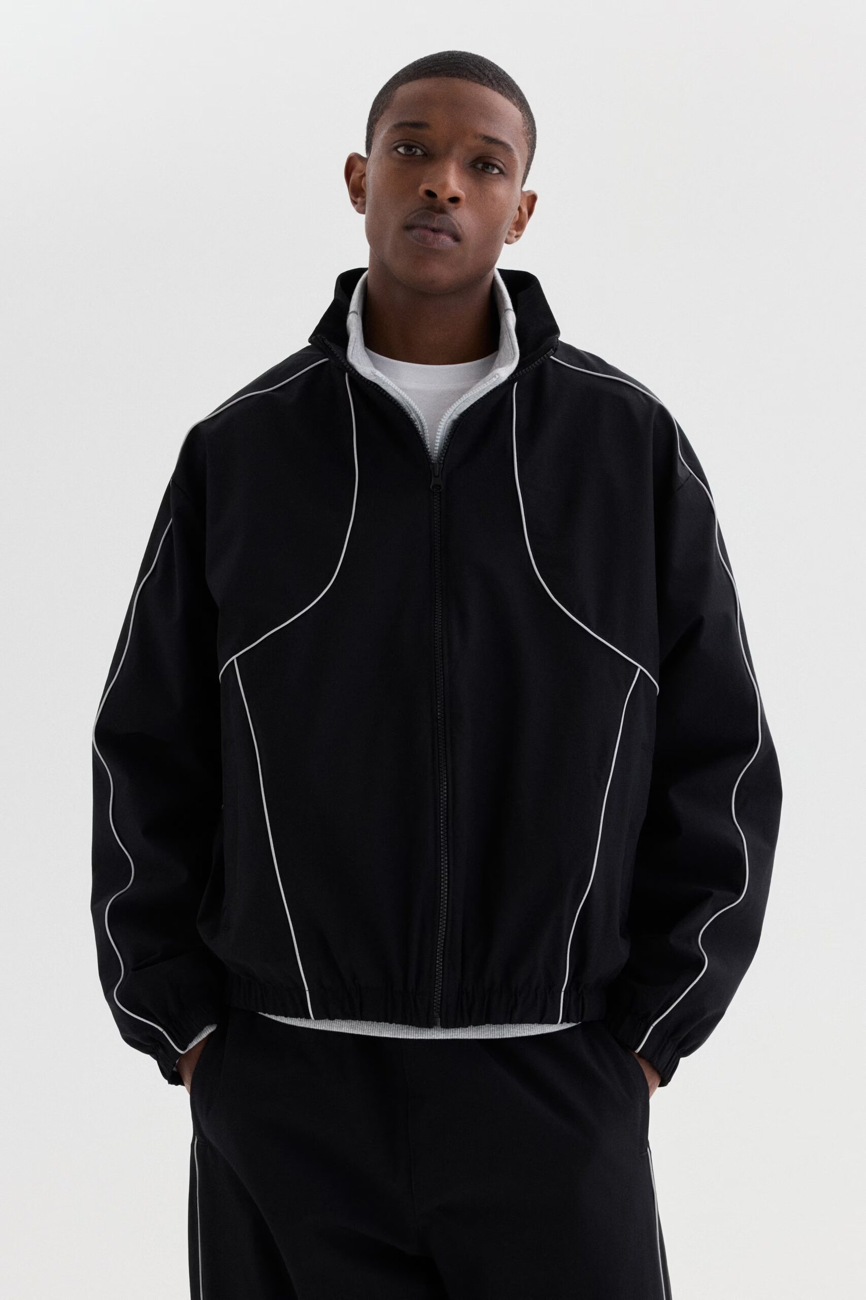 Upgrade your casual wardrobe with this Premium Black Sports Track Jacket. Designed with a modern athletic fit and stylish white contrast piping, this jacket gives a bold and confident look.