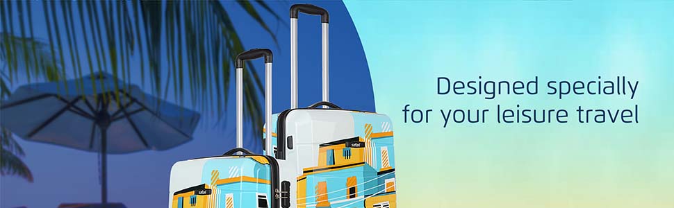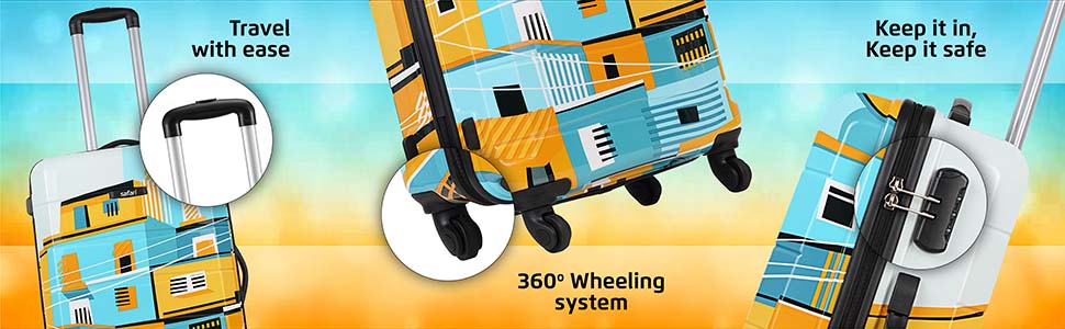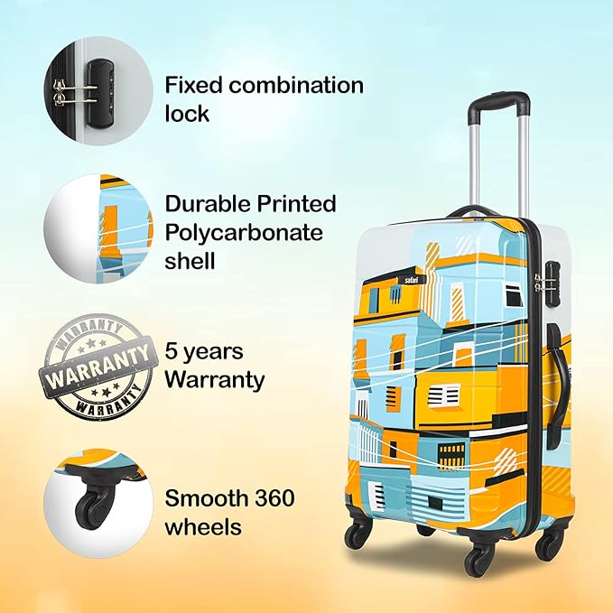 Travel in style with this eye-catching Safari hard shell trolley luggage set featuring a vibrant blue and yellow cityscape print. Designed for modern travelers, this 2-piece combo includes a cabin size and a medium size suitcase – perfect for short trips, business travel, or family vacations.